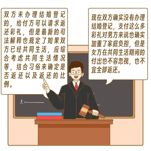 第六条 双方未办理结婚登记但已共同生活,一方请求返还按照习俗给付的彩礼的,人民法院应当根据彩礼实际使用及嫁妆情况,综合考虑共同生活及孕育情况、双方过错等事实,结合当地习俗,确定是否返还以及返还的具体比例。
